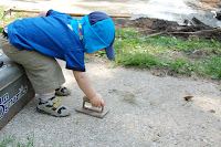 Here is a pic of the wee man helping out with his concrete tool and another of him being very interested with one of the trowels (he did actually get to use it in the wet concrete at one point!). We spent close to 6 hours outside and it was almost impossible to get him to stop and eat or drink as it was all so exciting! I finally put him in his buggy (stroller) around 4pm as he was exhausted but not wanting to miss any action (plus they were cutting the concrete - prevents it cracking in the Winter for those who wonder why on earth they would do such a thing to such a beautiful piece of work!) and we went for a walk to post Oskar's birthday presents and he fell asleep on the way home. As I type this it is around 6pm and no sounds are emitting from upstairs as yet!